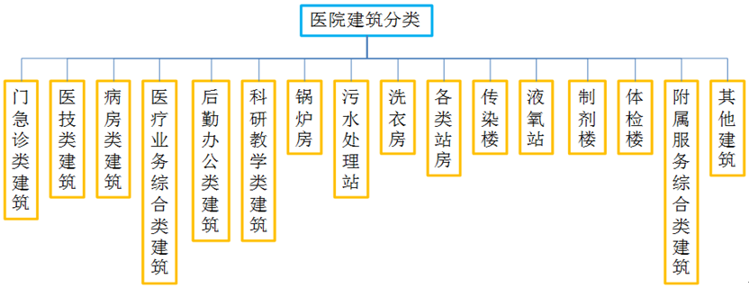 醫(yī)院建筑根據(jù)醫(yī)療用途可分為門診類建筑、醫(yī)技類建筑、病房類建筑、醫(yī)療業(yè)務(wù)綜合類建筑、后勤辦公類建筑、科研教學(xué)類建筑、鍋爐房、污水處理站、洗衣房、各類站房、傳染樓、液氧站、制劑樓、體檢樓附屬服務(wù)綜合類建筑等,如圖所示。