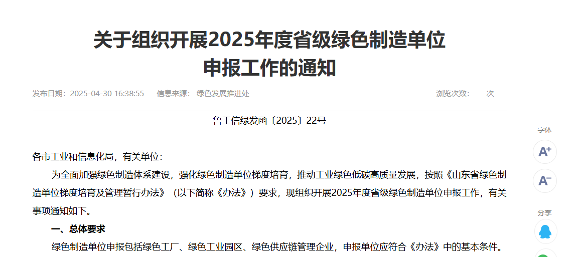 為全面加強(qiáng)綠色制造體系建設(shè),強(qiáng)化綠色制造單位梯度培育,推動(dòng)工業(yè)綠色低碳高質(zhì)量發(fā)展,按照《山東省綠色制造單位梯度培育及管理暫行辦法》(以下簡(jiǎn)稱《辦法》)要求,現(xiàn)組織開展2025年度山東省綠色工廠、綠色工業(yè)園區(qū)申報(bào)工作。